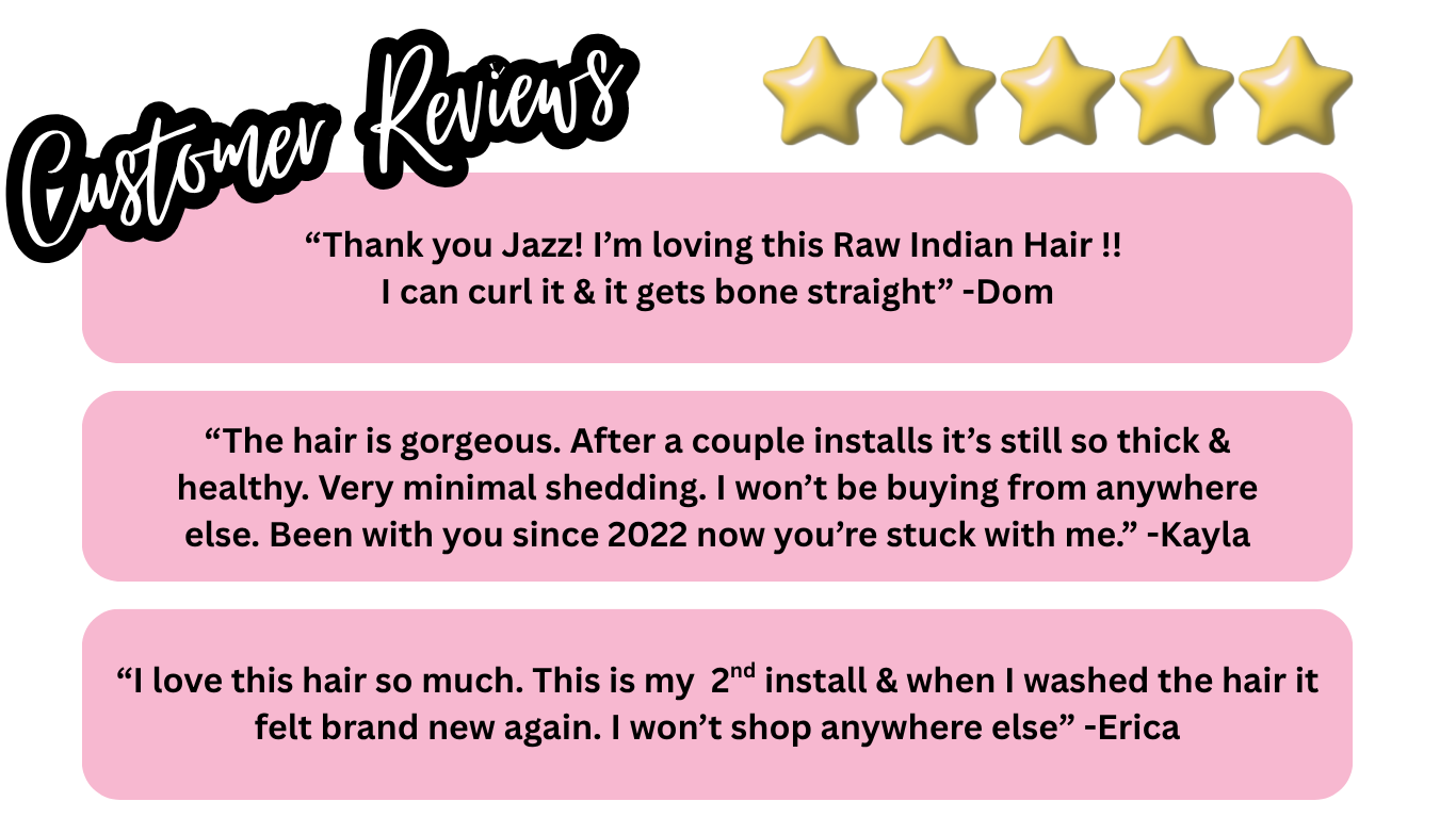 Hello beautiful people. My name Jazz. Iβm a Licensed Cosmetologist, entrepreneur, mother & boss. I'm thrilled to introduce you to my premium hair website where I offer top-notch hair. With nearly a decade of experience in the hair industry, I dedicate myself to upholding the excellence & standard of my brand. Here you will find top quality RAW INDIAN hair bundles straight from India. We also provide Brazilian bundles, lace , half wigs & more.
